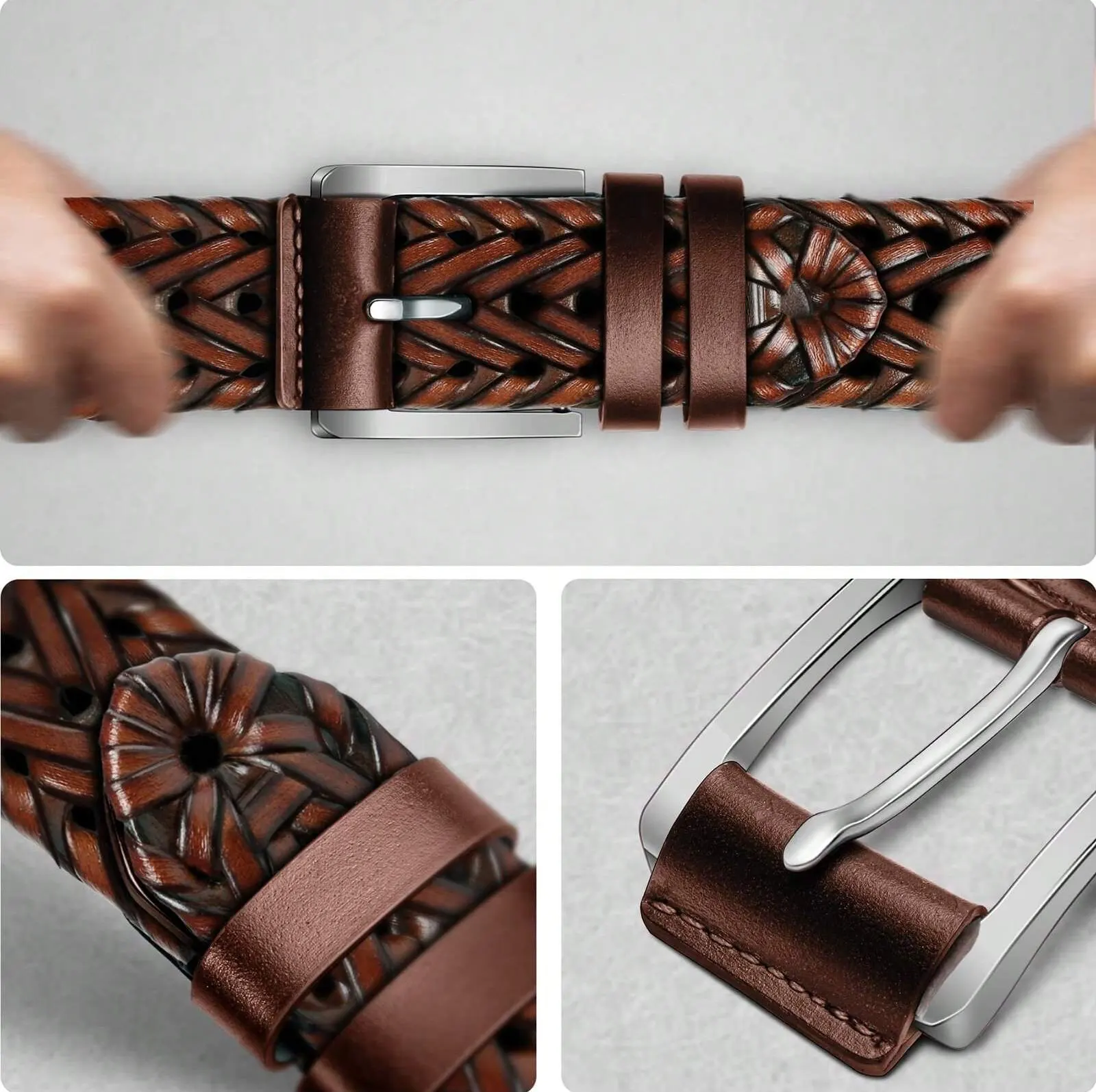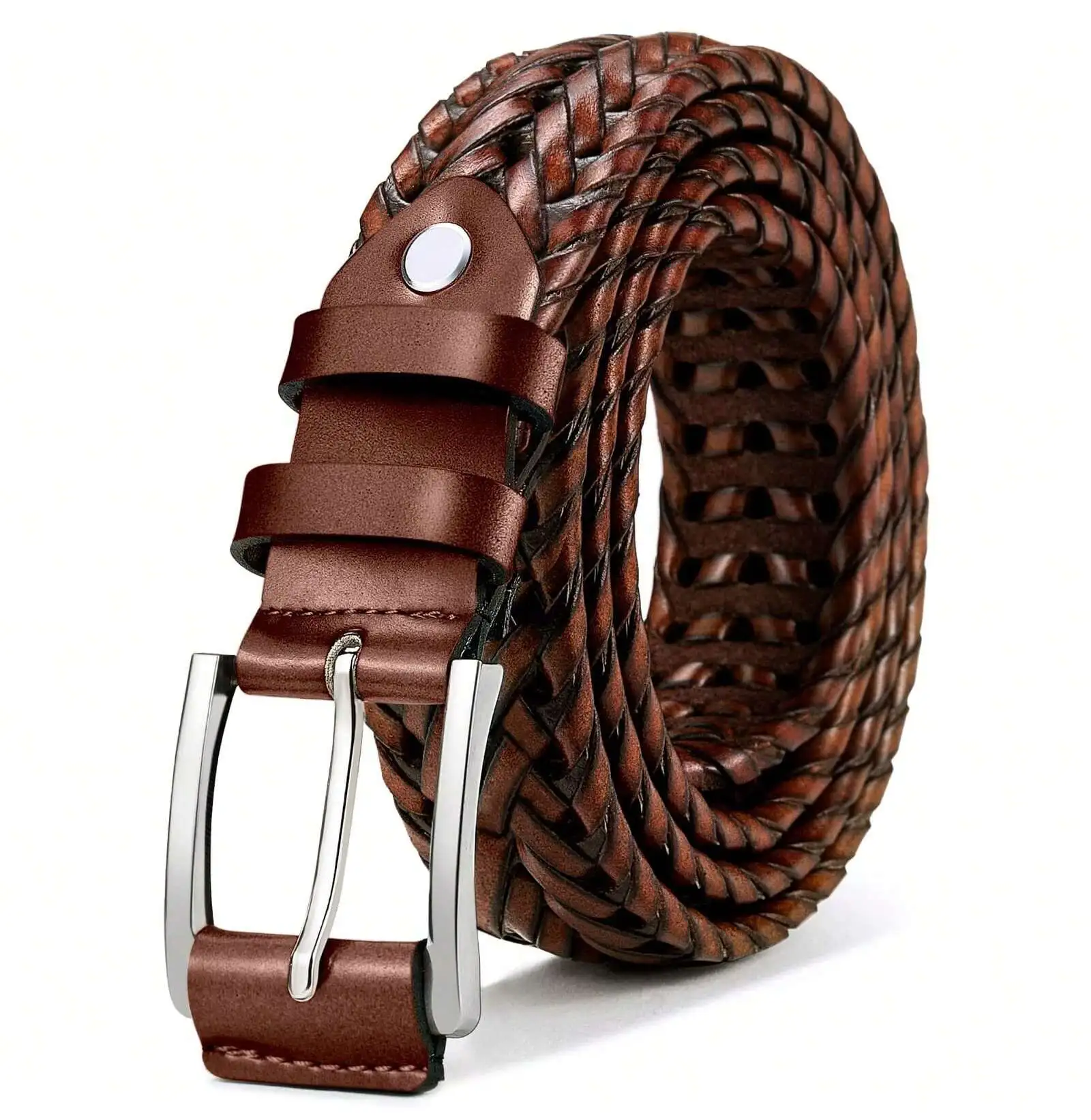 This braided leather belt features a flexible woven design that allows the buckle to fasten at any point along the strap—delivering a fully adjustable fit tailored to your waist. Perfect for everyday wear with jeans, chinos, or even golf attire.